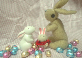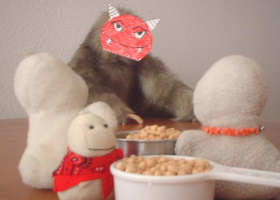| 雅之:オーガニック屋さんで大豆は買えたけど、升が無いよ。 柚子:計量カップでいいんじゃないの? 雅之:あ、つん太、撒く前に食べちゃ駄目! つん太:…これ、お砂糖がかかってないよ〜。甘くない〜。ぷんぷん! |