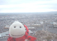 | 1月1日、El paso市内の山に沿った観光道路、Scenic drive。 途中の展望台からメキシコ方面を望む。 つん太の頭の上に走っている横線と地平線の真中あたりが国境線。 「あっちはフラン(プリン)の国だねぇ」と呟いたつん太。 これが、私たちの手元に残ったつん太の最後の写真になってしまった。 |