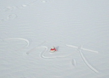 | 砂の上に大きく「つん太」のサイン。 あとから来る人に踏まれて、風に吹かれて、 たぶんこの日のうちに消えてしまったろうけれど。 |
