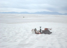 | 12月31日、White sands国定公園(地図「4」)。 真っ白な雪山のように見えるけど、これは石膏の砂。 「これが全部、お砂糖だったらいいのになぁ!」 埋めて帰ったろか、と意地悪く言ってやったら 「できる物ならやってみな♪」とにこにこ笑ってた。 |
