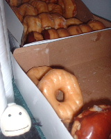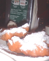 ![]() | 朝が空港のドーナツだけだから、お腹ぺこぺこ。 早速、この街の名物「ベニエ」に挑戦! ベニエっていうのは、揚げドーナツみたいな物。 沢山お店があるけど、ここ「カフェ ドゥ モンド」が元祖。 日本でもダスキンがチェーン展開してるんだってね。 有名店だけあって、店の外には長〜い行列。 待って待って、ようやくぼくたちの番。 |