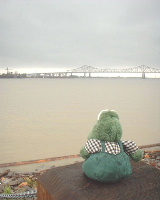 | ドーナツ屋さんの裏手は、ミシシッピ川。 雨なのに、ぬいは濡れちゃって危険なのに、 拓ちゃんがどうしても川を見たいって言って 鞄の外に出してもらった。 拓ちゃんの憧れの地、ミシシッピ。 心のふるさと、ミシシッピ。 川岸はごみだらけで汚かったけど、 拓ちゃんは目に入らないみたい。 明日は外輪船でミシシッピ・クルーズ、 | ![]() |