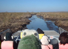 | 今日は、ようやく雨があがった。 相変わらず寒いけど、昨日よりはマシ。 さあ、拓ちゃんお待ちかね、 「スワンプ(湿地)・ツアー」に出発! 湿地帯に住んでる野生のワニさんや 亀さん、野鳥さんたちに 船に乗って会いに行くツアーなの。 でも、冬はワニさん、寝てるんだって。 拓ちゃん、またまた残念! | ![]() |