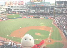 | 01年8月26日。 アーリントン・ボールパークで野球観戦。 写真を撮ってたら、球場職員のお姉さんに「それは何?」て聞かれた。 「それ」はひどいけど、かわいいと誉めてもらえて、つん太、大満足。 |